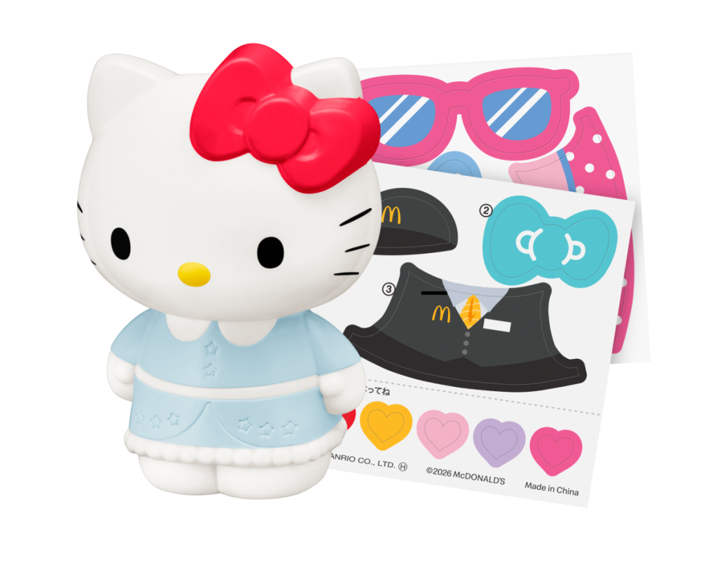 ハローキティにドレスやマクドナルドクルーユニフォームのシールを貼って、きせかえ遊びができます。