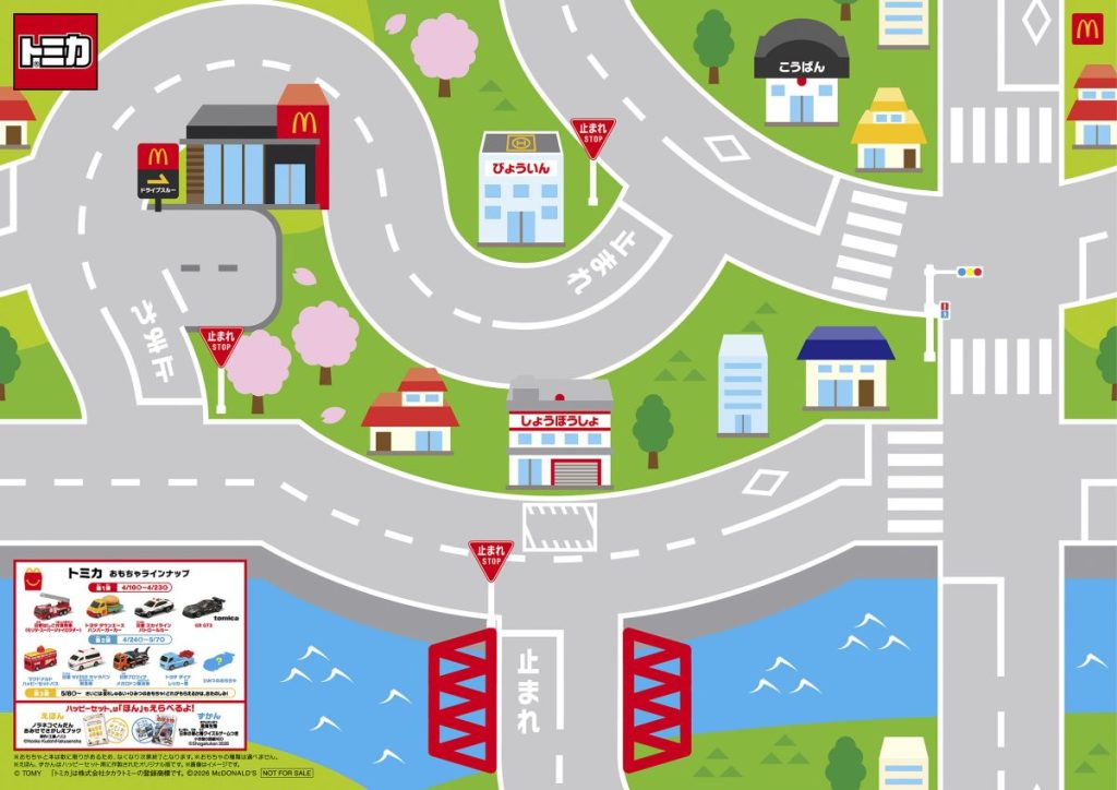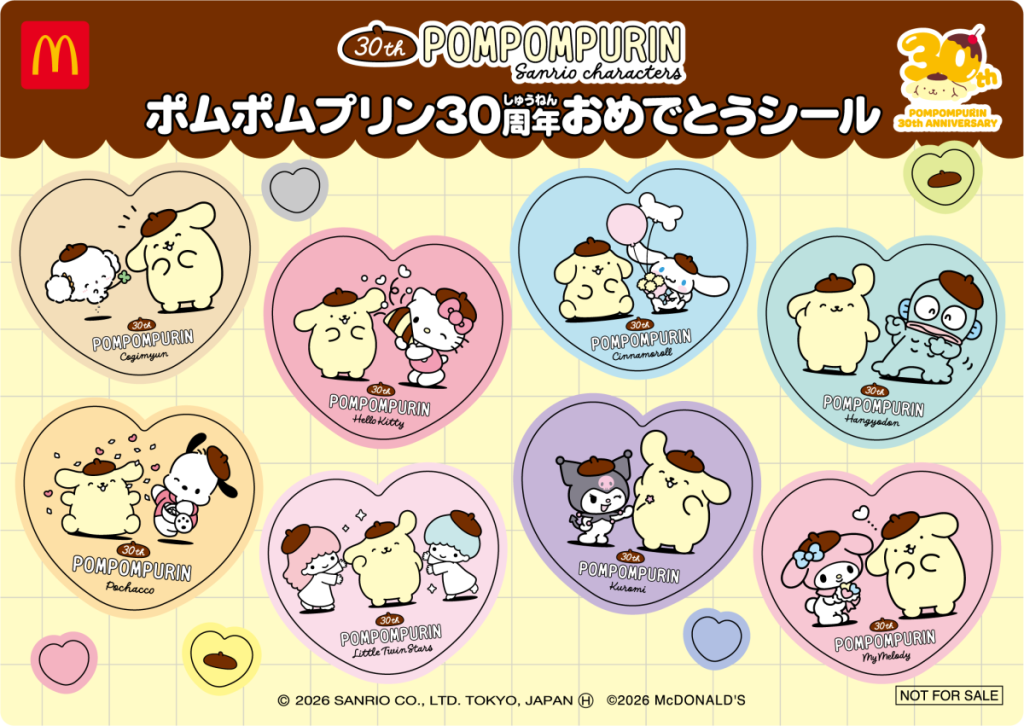 さらに、4月25日(⼟)・26日(日)の2日間は、ハッピーセット「トミカ」を1セットご購入につき「トミカ プレイングシート&GRポスター」を、ハッピーセット「サンリオキャラクターズ」を1セットご購入につき「ポムポムプリン30周年おめでとうシール」の数量限定プレゼントもあります。