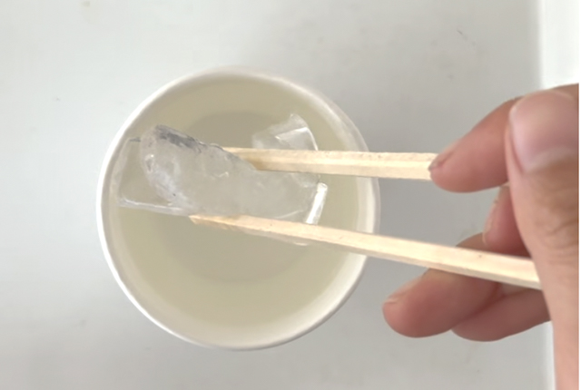 2. プラスチック粘土は80℃以上のお湯でやわらかくなり、冷えると固まります。まず紙コップに 80度以上のお湯を入れ、プラスチック粘土を浸して約3分待ちます。火傷には十分気をつけましょう。