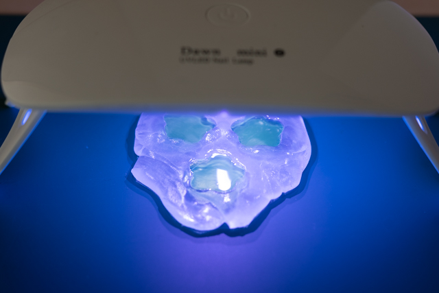 6. レジン硬化用のライトを照射して、レジンを固めます。こちらのライトも、100円ショップにて330円商品として販売されています。硬化中、のぞきこんでライトに目を近づけないよう、注意してください。