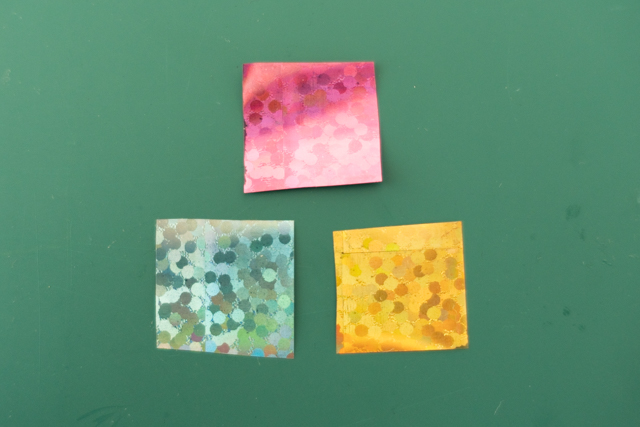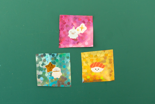 13. 折り紙を背景に使った場合は、裏側に「しーるん」などの液体状シールのもと、または小さくカットした貼って剥がせる両面テープを貼れば、完成です!