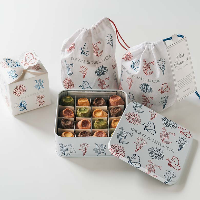 『DEAN & DELUCA』には、華やかでギフトにもぴったりなクッキー缶も豊富です。こちらは菓子研究家の福田里香さんと手がけた、フランスの伝統菓子「プティディアマン缶」シリーズ。写真左:「プティ・ディアマン」ボックス 税込み1,512円、写真中央下:缶 税込み3,564円、写真中央上:バッグ 税込み1,728円。