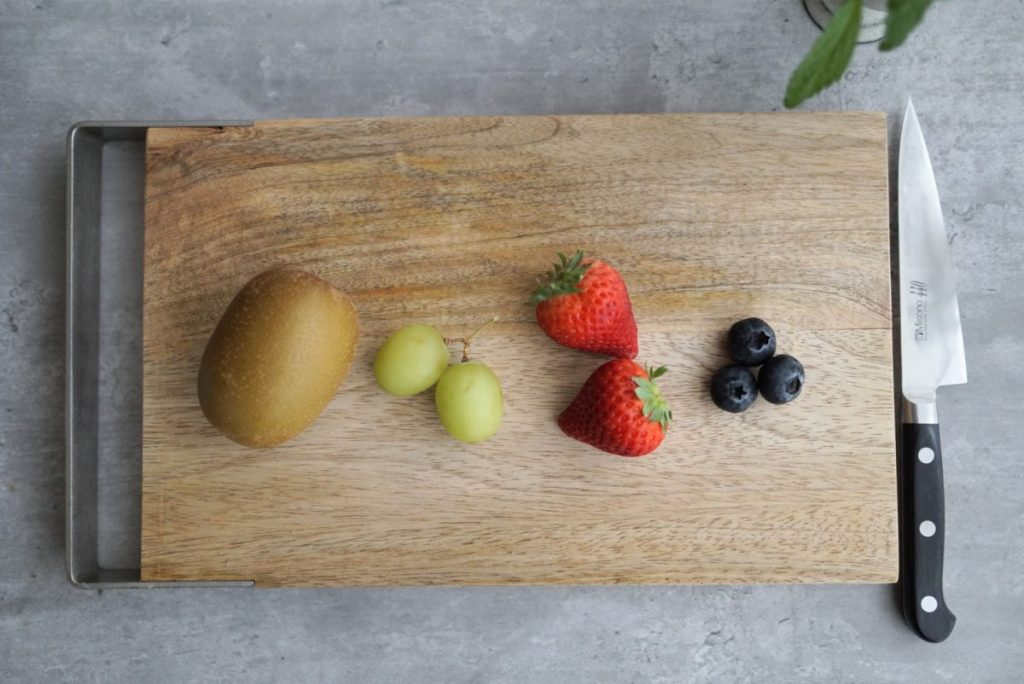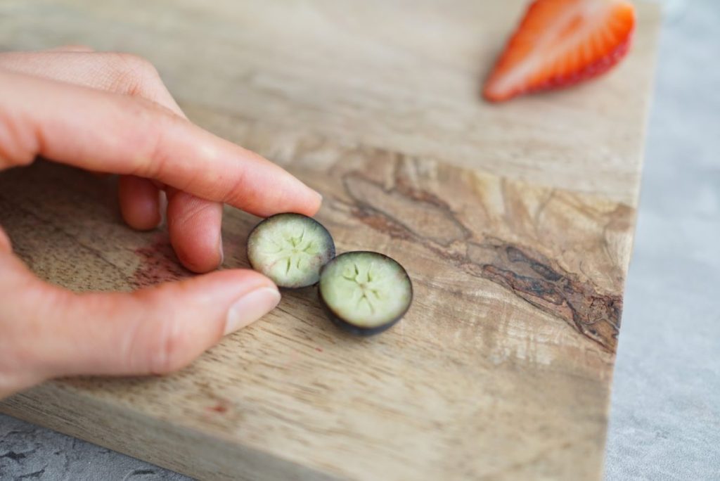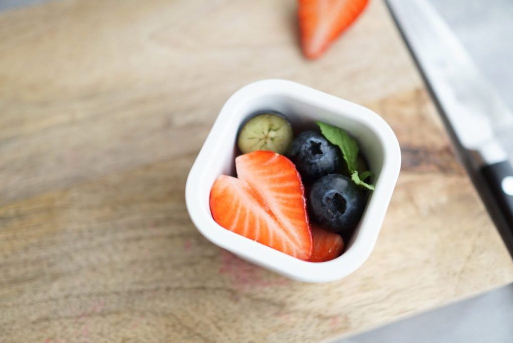 ぶどうやいちご、ブルーベリーなど、ついそのままポイッと入れがちなフルーツですが、「カットして断面を見せる」だけで、見た目の鮮やかさが格段に変わります。