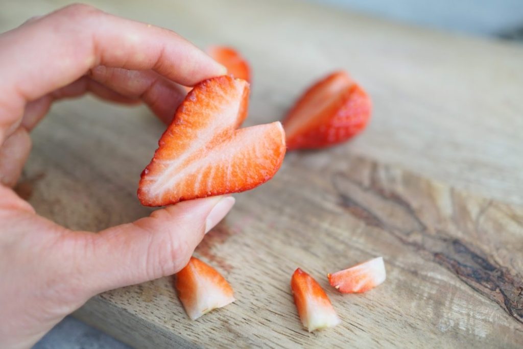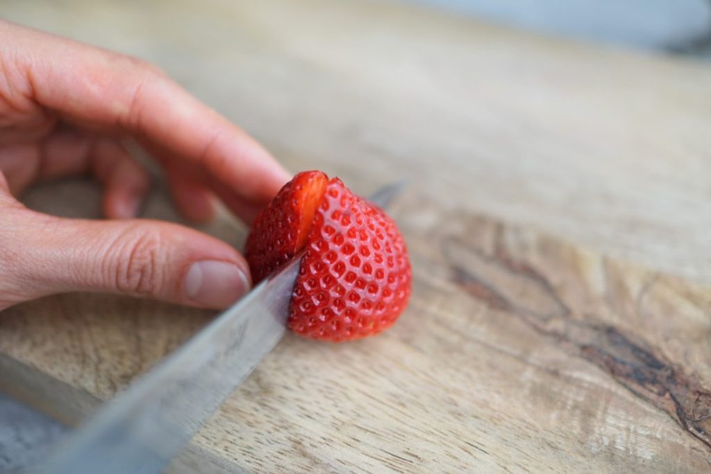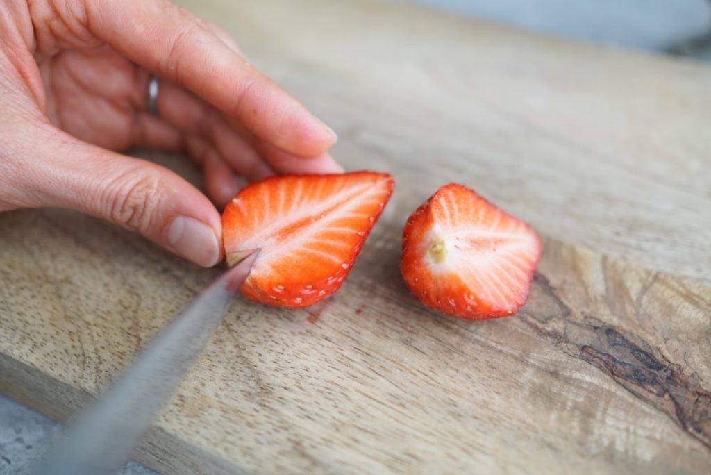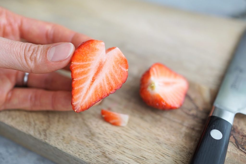 2. いちごを立てて、半分に切ります