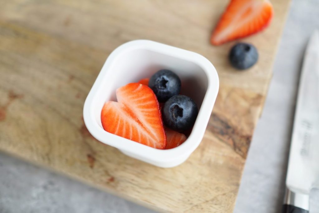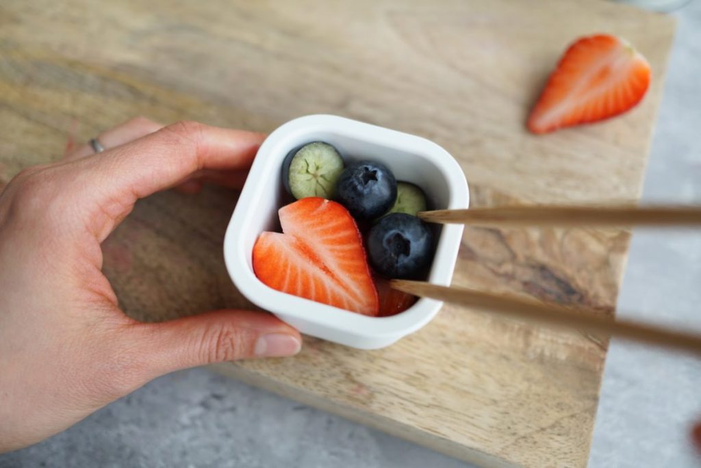 • 隙間に「ブルーベリー」や「半分に切ったぶどう」をコロコロと入れることで、持ち運び中に中身が崩れるのを防ぎ、見た目の密度もアップ!