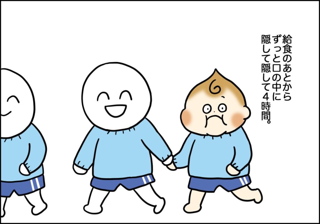 ハムスターのように、頬にずっと隠していました。一瞬我慢して飲みこんだ方が絶対楽なのに、嫌いなものを4時間も口の中に入れておくとはすごいなと思いました…!