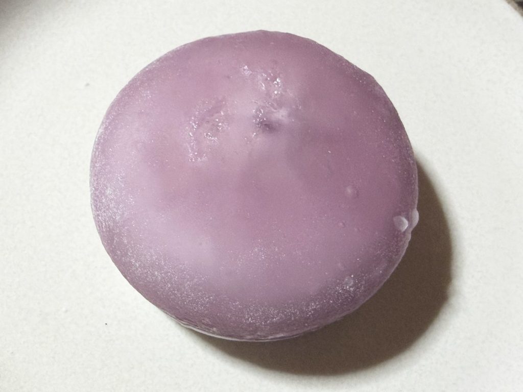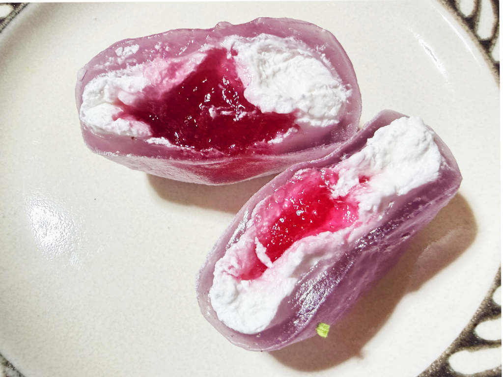 メタモンをイメージした紫色のわらび餅。ぶどう風味のやわらかいわらび餅で、ぶどう味のソースとミルクホイップを包み込んでいます。切ってみると、ソースがたっぷり! ミルクホイップと合わさっても、しっかりぶどう味を楽しめます。