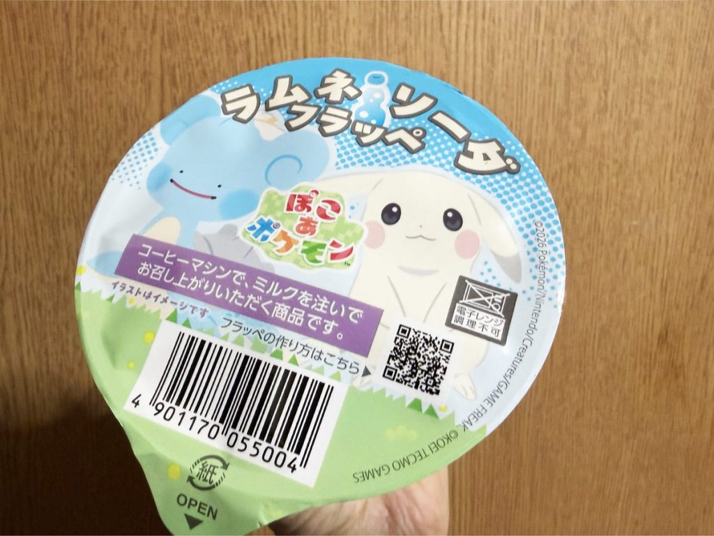 ラプラスにへんしんしたメタモンと、うすいろのピカチュウがパッケージに描かれた「ラムネソーダフラッペ」。口のなかでぶどう味のラムネがパチパチ弾けて、味わいが変わるのを楽しめます。つぶつぶラムネをかじると、ふわっと甘みのある酸味が。初夏を迎える青空みたいなブルーも映えますね。