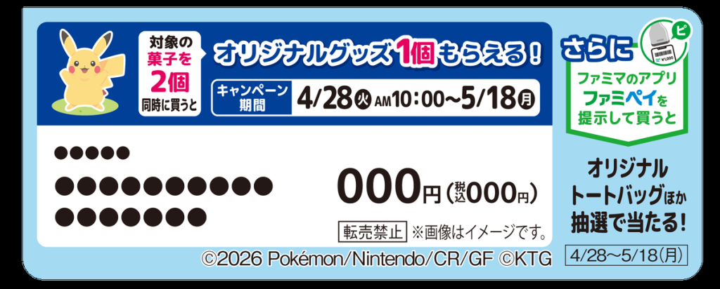 期間中「ファミペイ」を提示して、対象商品を購入すると、1商品につきスタンプが1個たまります。ためたスタンプ数に応じて、『ぽこ あ ポケモン』デザインのオリジナルトートバッグなどが当たります。