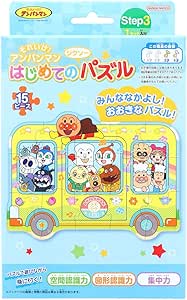 アンパンマンとなかまたちがバスに乗っている楽しいパズルです。2歳でも楽しめる15ピース。