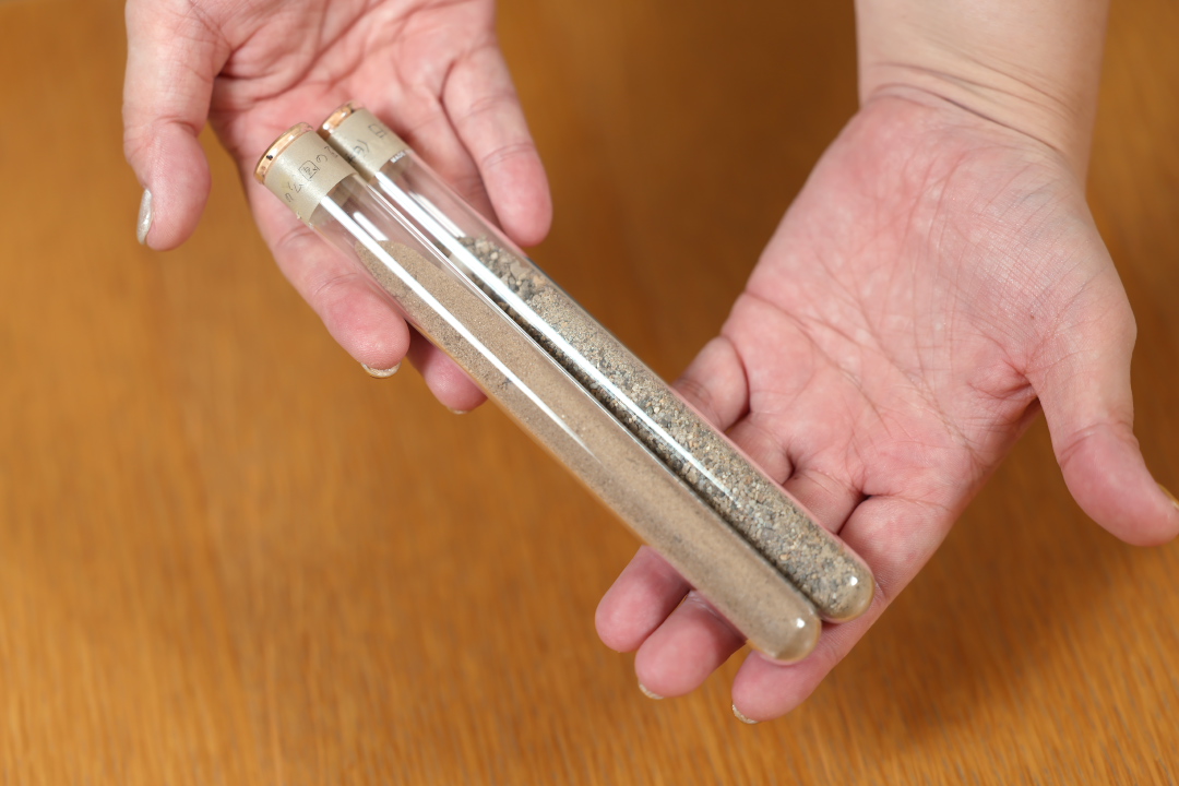 左がベルギーの砂場の砂。右が日本の砂場の砂。一目見ただけで細かさが全然違います。