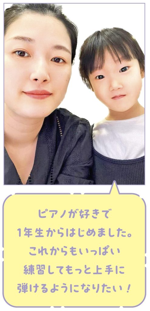元からピアノが大好きでヤマハに通い始めましたが、レッスンを受けるようになってからもっと好きになったようです。ピアノを買ってからは、家でも自分から進んで練習していて、楽しく演奏している姿を見ていると成長したなと感じます。ヤマハで新しいお友だちもたくさんできて、ピアノを弾くこと以外の楽しみもふえたようです。