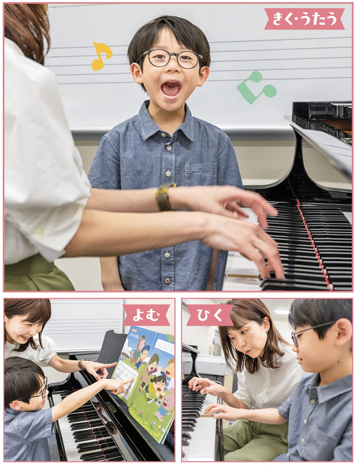 プレジュニアのレッスンは、「きく」「うたう」「ひく」「よむ」「つくる」の要素をバランスよく体験します。うたうことで曲を覚えておくと、自分でイメージを持って演奏することができるので、間違いに自分で気づけたり、曲の表情や変化を感じながら弾くことができます。将来的にはメロディーに合う伴奏をつけたり、曲を作ったり、楽譜通りに弾くだけでなく、自分で音楽を楽しむ力をつけることもめざしています。