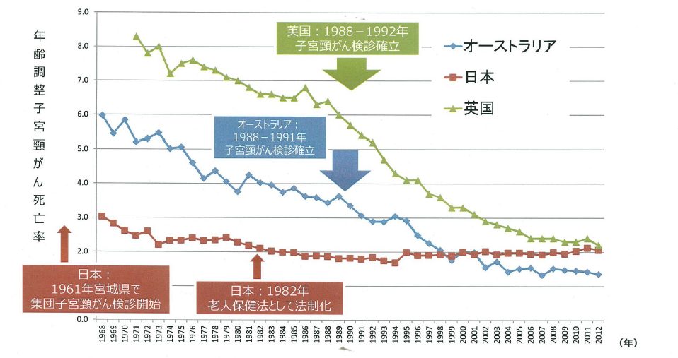 上の表は、イギリスとオーストラリア、日本の子宮頸がんによる死亡率の推移のグラフです。イギリスとオーストラリアは、子宮頸がん検診の確立によって死亡率が大幅に減少していることがわかります。一方日本は、横ばい状態がずっと続いています。