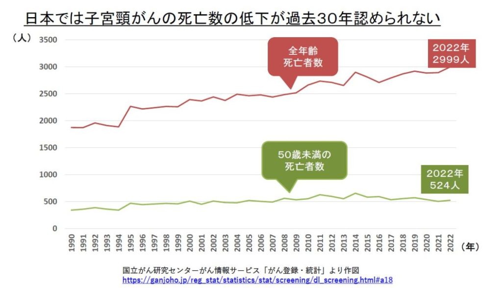 国立がん研究センター調べによると、過去30年にわたる子宮頸がんの死亡者数は、全年齢ではやや増加、50歳未満では横ばいです。また30歳代までにがんの治療で子宮を失う人は、年間約1,000人にのぼります。