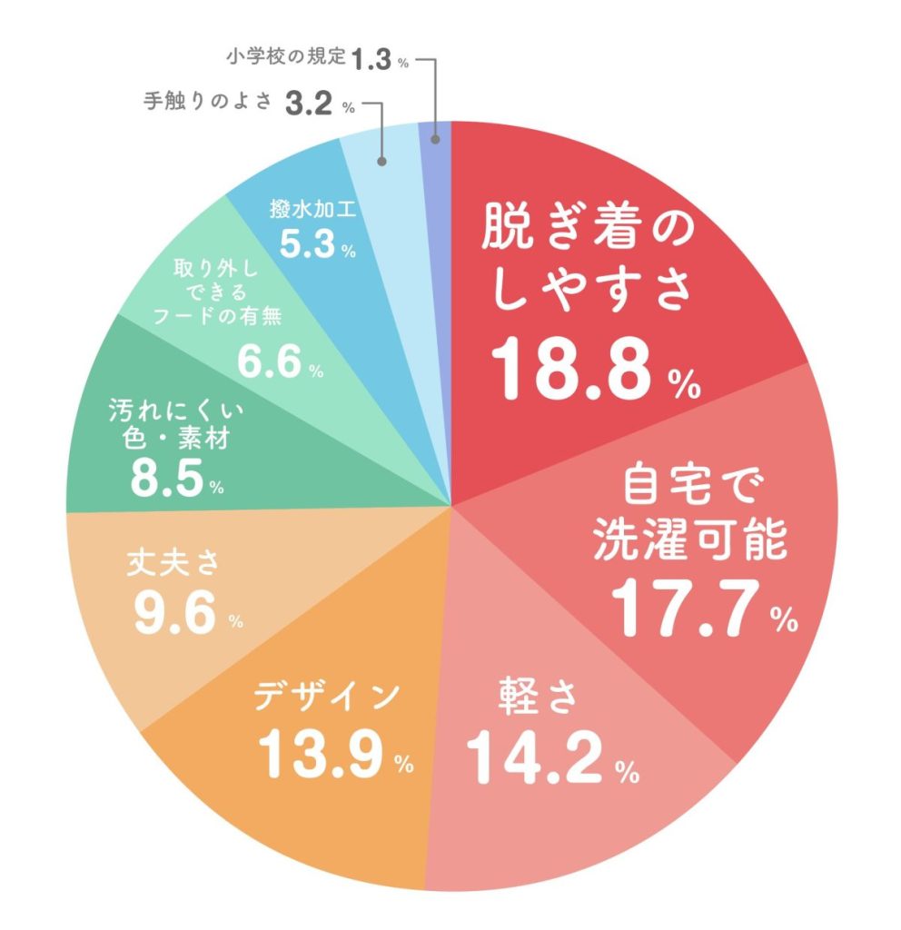 「脱ぎ着が楽なものでないと、子どもが着たがらない」や「厚手の素材にしたら子どもが嫌がった」など、まず子ども1人で着やすいかどうか、が重要ポイントのよう。そして自宅で洗えることも大事! 特に「袖口が本当に汚れる」という声が多かったです。ほか、「ランドセルが重いのでアウターは軽さ重視」、「こだわりが強いので子どもの気に入るデザインが第一」という声も。