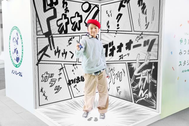 選んだアイテムを手に、いよいよLEDスタジオへ。3面に広がる映像に包まれると、一気に空気が変わります。まるでその世界に入り込んだかのような映像と演出は、アトラクション感たっぷり。子どもたちは、漫画を描くポーズをしたり、シュートを決めるポーズをしたり、ギターを弾く仕草をしてみたり。少し照れながらも、表情はどこか誇らしげです。