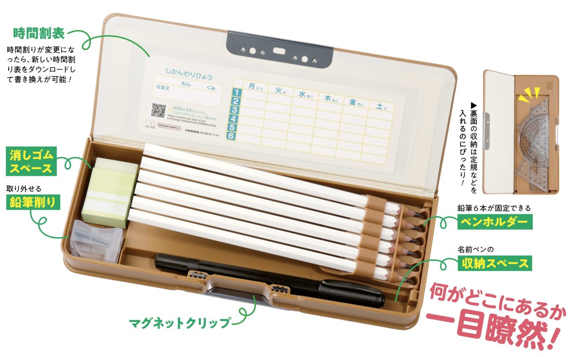 通常のふでいれよりコンパクトサイズで、ランドセルの横幅にぴったり収まります。荷物がいっぱいでも安心です。