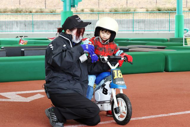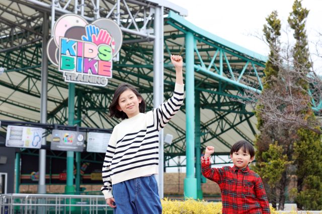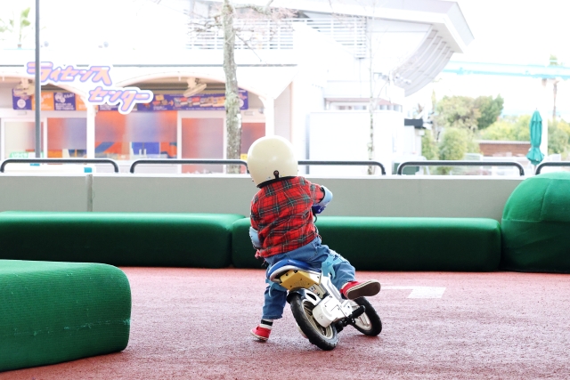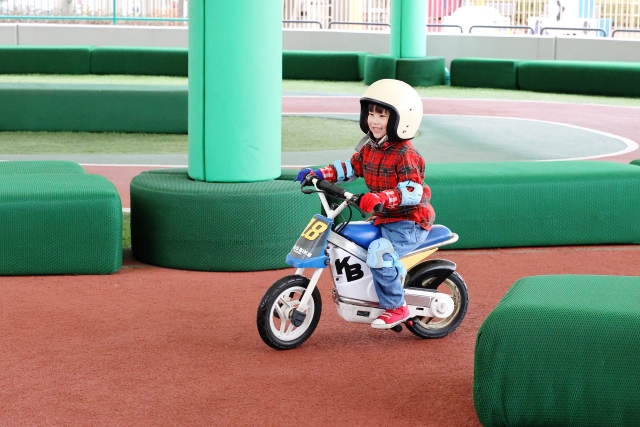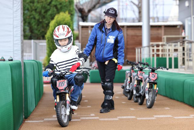 「キッズバイク トレーニング」は、子どもが自分の力で本格的なバイクを操作する体験ができるアトラクションです。アトラクションは親から離れて子どもだけで挑戦するスタイルで、保護者は柵の外から見守ります。