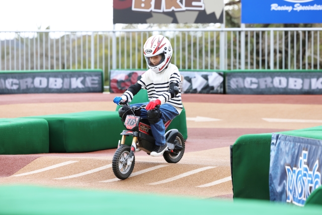 キッズバイクトレーニングでバイクの基本をつかんだあと、お兄ちゃんのシュンくんが挑戦したのは「アクロバイク」。オフロードコースを走るモトクロス風のバイクで、ブロックタイヤやサスペンションが衝撃を吸収しながら、デコボコのコースを2分半走ります。