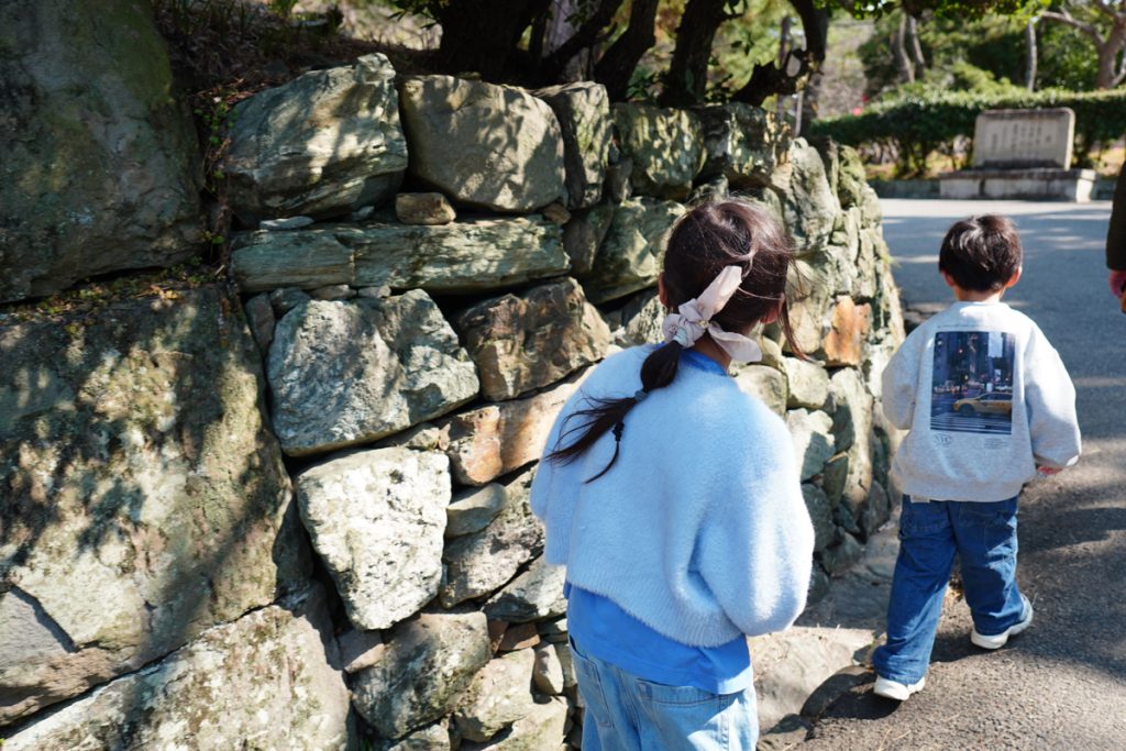 もらった手裏剣を片手に天守閣を目指します。大きな石垣を横目に歩いていると、「和歌山城石垣の刻印について」という案内を発見。新裏坂周辺の石垣で見ることができるそうで、なんのための刻印かははっきりわかっていないそうです。約170種もの刻印があるそうなので、子どもと探し歩いてもよさそうですね。