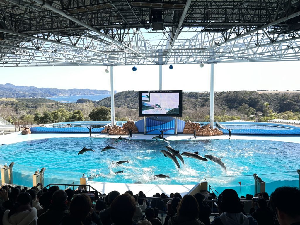 午後は動物園・水族館・遊園地が一体化した「アドベンチャーワールド」へ! 東京ドーム約17個分の敷地に、120種1600頭もの動物が暮らしています。ちょうどイルカのライブパフォーマンスをおこなっているタイミングで、何頭ものイルカがタイミングをそろえてジャンプする様子は圧巻でした!