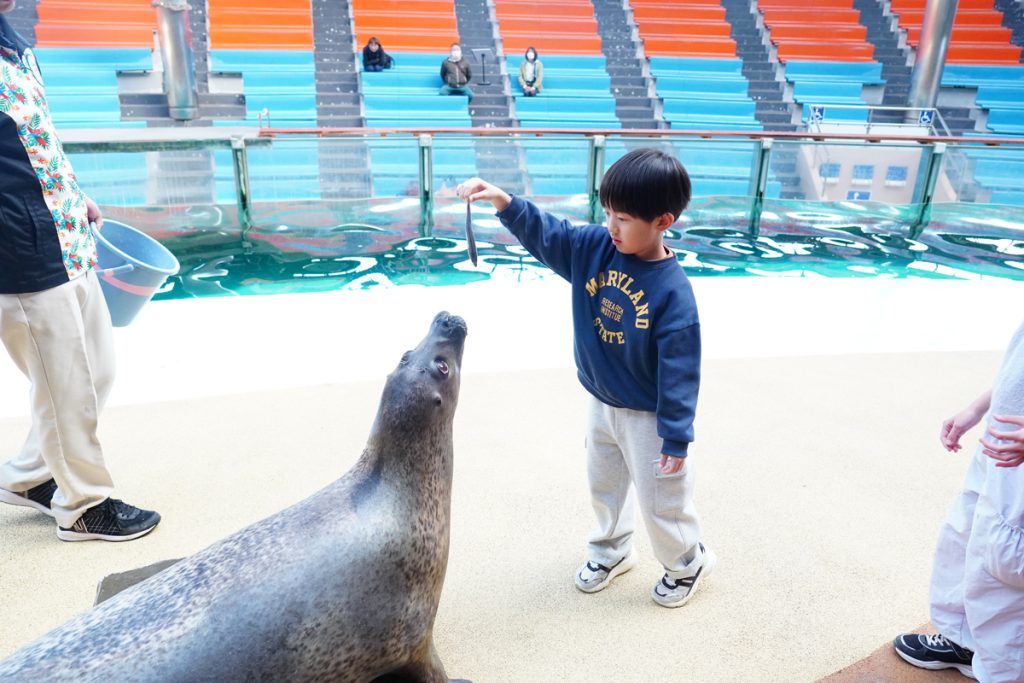 アシカの次はアザラシです。ゆっくりステージ上に上がり、飼育スタッフが連れてきたアザラシと間近で対面! 一人2尾、アザラシに魚をあげることができます。グイーンとアザラシが首を伸ばしてくるので、上の方でパッと手を離すと上手に口の中へ! 近づけすぎないよう注意してくださいね。