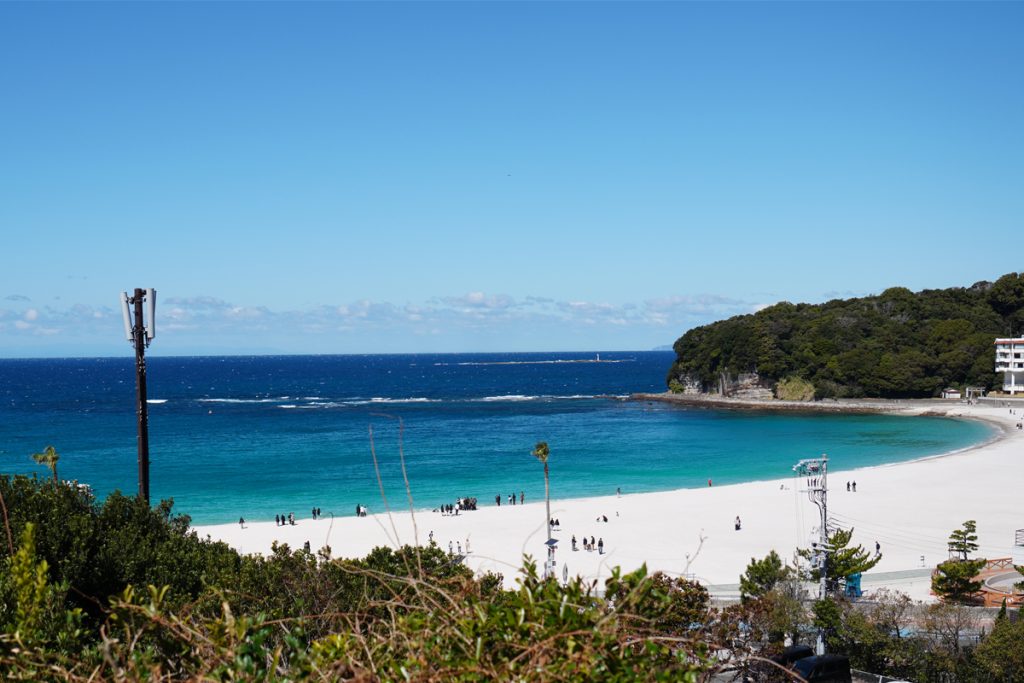 往路は飛行機で。羽田空港から南紀白浜空港へ、約1時間15分で到着です。 この日は天気に恵まれ、青い海と白い砂浜が絶景! 大人も子どもも思わず歓声をあげました。
