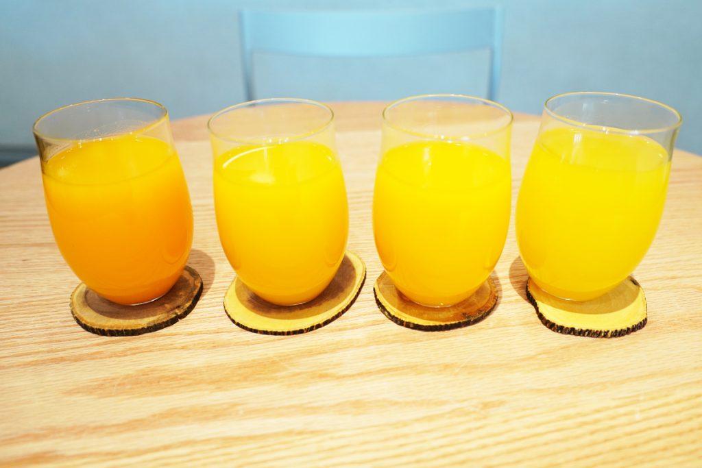 「みかん」「きよみ」「セミノール」「はっさく」の4種類のジュースを飲み比べ。「みかん」がもっとも色が濃くて甘く、だんだん色が薄くなり酸味が増して、「はっさく」がもっともスッキリとした飲み口でした。