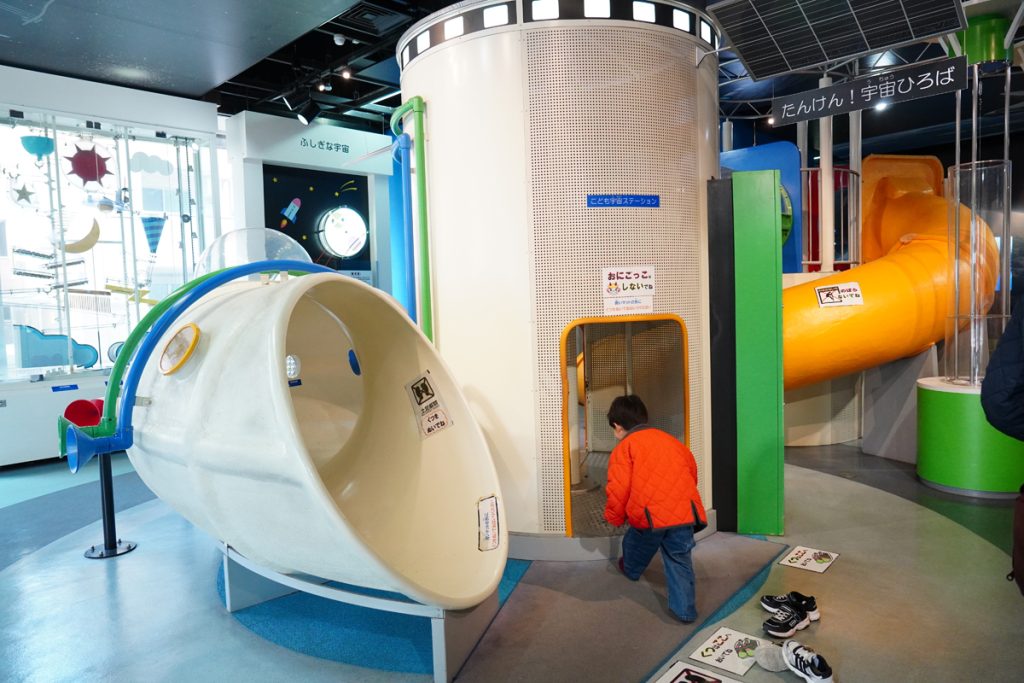 2日目のスタートは昭和56年に開館した「和歌山市立こども科学館」から。プラネタリウムを観に来たのですが、入った瞬間から宇宙をモチーフにした遊具・展示があり、子どもたちが大喜び!