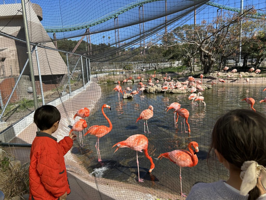 子どもたちの目に留まったのはフラミンゴの群れ。「濃いピンクの方がオスだよ」「中央の島では卵をあたためているフラミンゴがいるよ」などスタッフから教えてもらい、「へえ〜!」と興味津々に眺めていました。