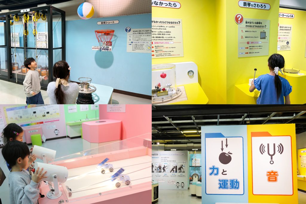 2Fに上がると「ふしぎ体験! 科学広場」があり、ここが面白くて大人も子どもも夢中に! 「音のコーナー」「力と運動のコーナー」「電気と磁力のコーナー」「光のコーナー」それぞれに体験型の展示が多くあって大充実。