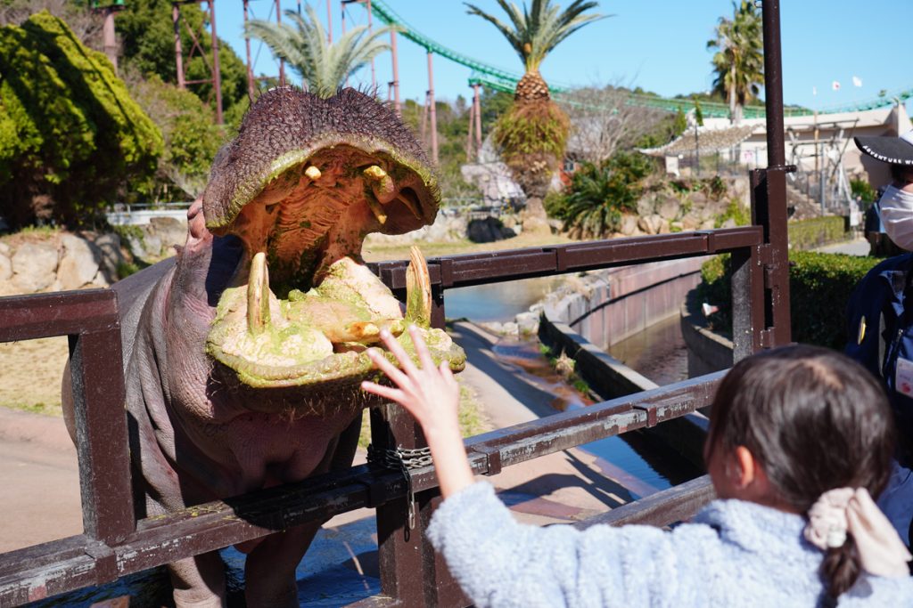 子どもたちは動物園でカバを見たことはあっても、おやつをあげるのは初体験。「カバは何を食べるの?」「うわあ、においがすごい!」と興奮しながら目の前に行くと、カバはパカっと大きな口をあけてスタンバイ。柵越しにおやつを投げ与えると、むしゃむしゃおいしそうに食べていました。