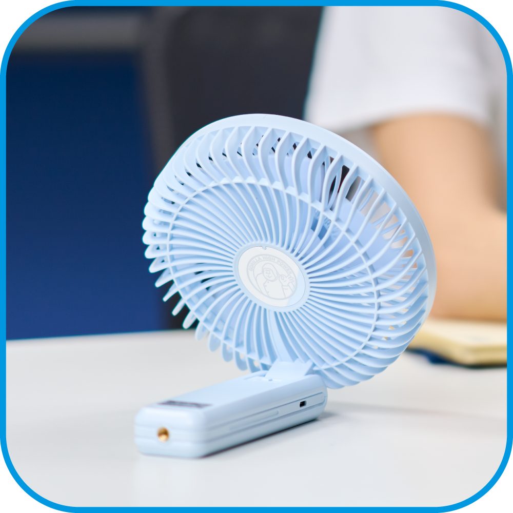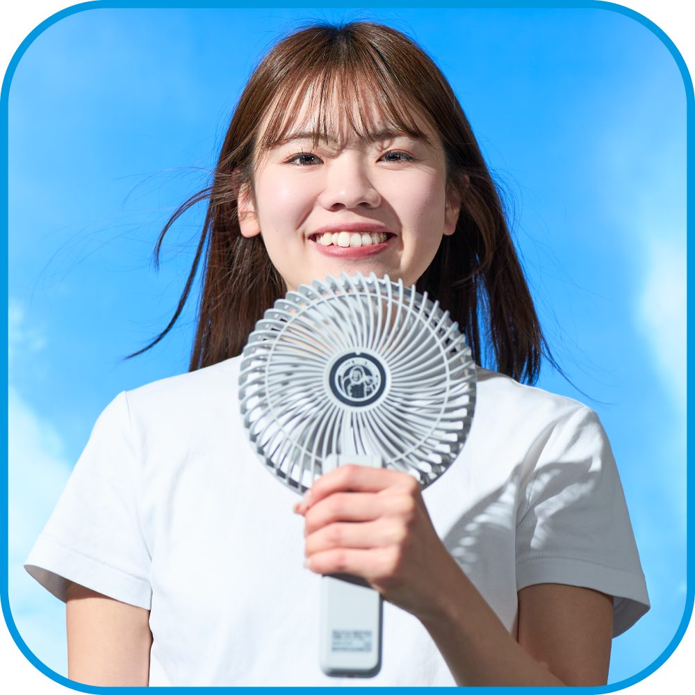 ハンディファンとは思えない直径16.5cmの大きさと、汗を吹き飛ばす「チョー強力! G(ゴリラ)モード」の搭載。サイズも風量もまさにゴリラ級! これひとつあれば、小さい子どもなら親と一緒に涼しむことができちゃいます。屋内はもちろん、アウトドアシーンでも活躍しそう。こんなに大きいのに、音は静かという点も高ポイント。