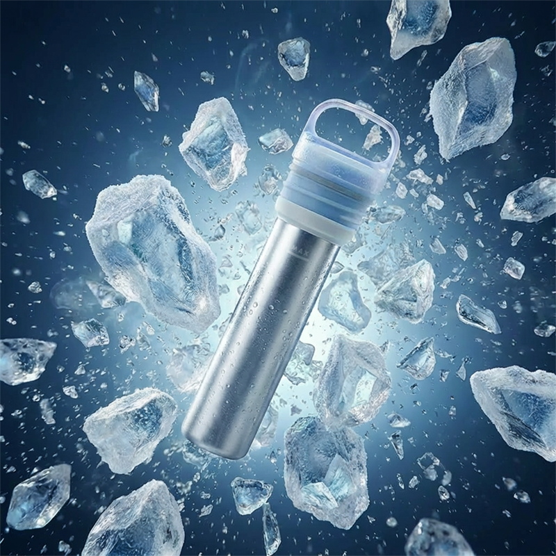 冷たさの秘密は氷のう部分。アルミ素材でできていて、凍った状態でなんと約2℃まで冷たくなるんです。一般的なシリコン製氷のうが約7℃(※)なため、その差は歴然。ホルダー部分は真空二重構造となっており、ホルダーの内側と外側の間にある真空層が、冷たさを逃さずキープしてくれます。